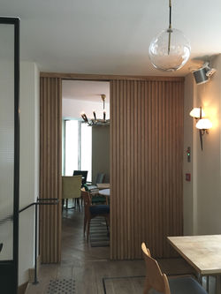 Pour le restaurant Mooty dans le 17ème arrondissement de Paris, une porte coulissante phonique en chêne bardée de tasseaux sépare l'espace bar de l'arrière salle privatisable.